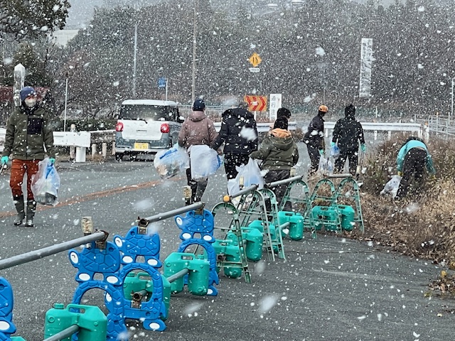 大道地区まちづくり推進協議会、大道地区社協の皆さんとクリーン作戦参加。雪の舞う中、小俣交差点セブンイレブン裏の道路のゴミの回収や分別、刈草の収集などの作業をしました。